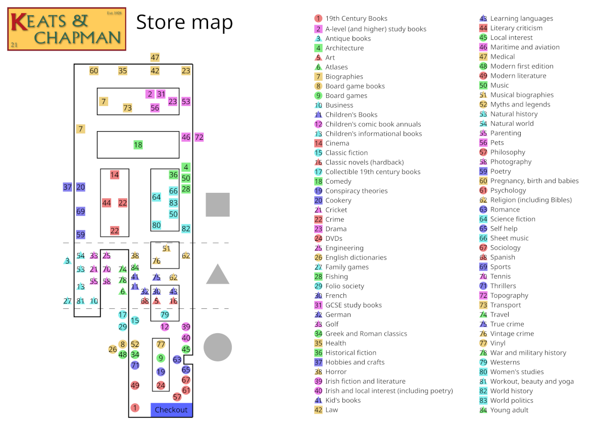 For example, Psychology is a red circle with the number 61. This puts it in the front circle area of the shop, in the cluster of red sections nearby the checkout. Looking closer shows that it’s just to the side of Checkout.